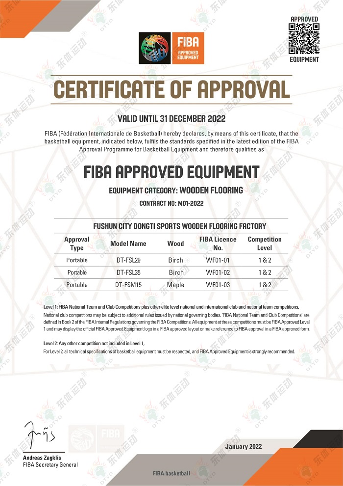 “東體運動”木地板系列產品已經通過國際籃聯檢測、世界羽聯認證、歐盟體育地板專項標準CE認證、歐盟環保產品CE認證、FSC世界森林協會認證、五星級售后服務企業認證等,是中國職業籃球俱樂部遼寧沈陽三生飛豹籃球俱樂部官方合作伙伴,內蒙古籃球協會戰略合作伙伴。